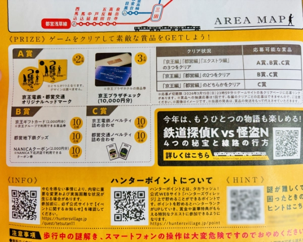冊子の問題を解くと向かうべき駅名がわかり、現地探索でキーワードをゲット。ゲーム専用サイトで送信すると、続きのストーリーや次に行うべき行動がわかる構成。過去シリーズと比べて、各編とも降車駅が多かったと思います。